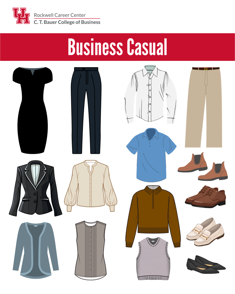 Business casual attire is less formal than business professional but still maintains a neat, polished appearance. It is commonly worn for on-campus events, employer info sessions, class presentations, and casual networking.